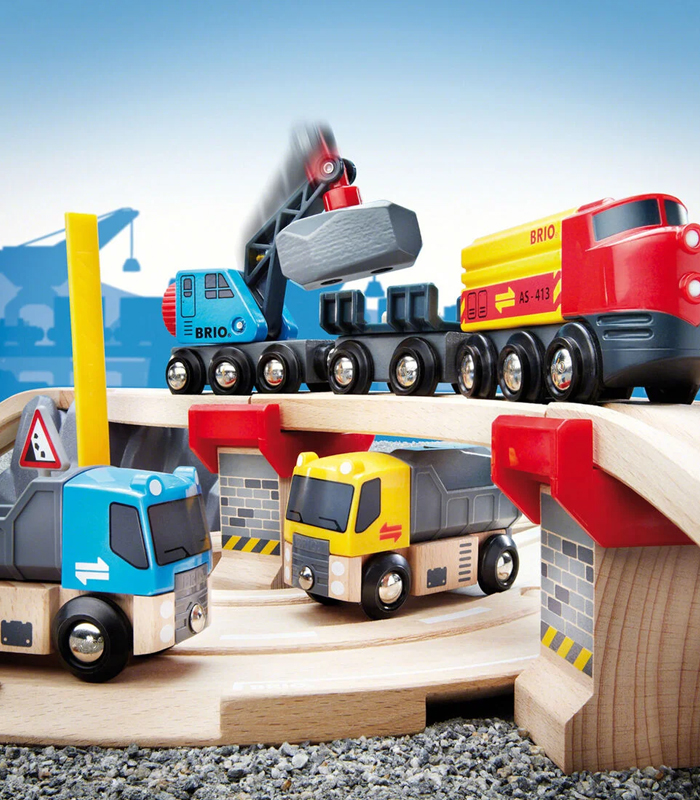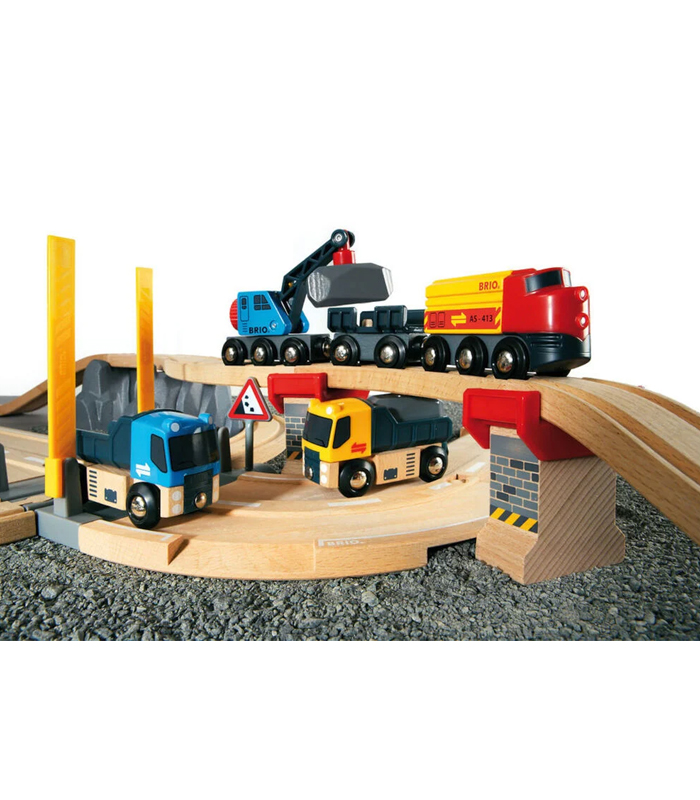 BRIO World Tog- og Veilastesett er en versjon av BRIOs populære togbane i tre. Denne klassiske togbanen bygges opp ved et steinbrudd med heftige detaljer.