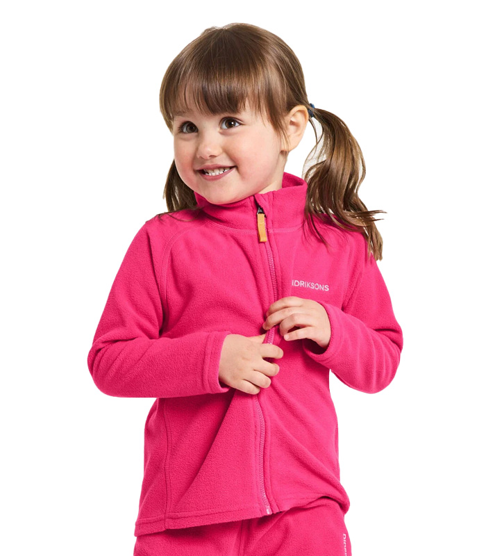 Monte fleecejakke fra Didriksons med en børstet innside for en ekstra myk og varm følelse. Den har en lang glidelås med en hakebeskytter.